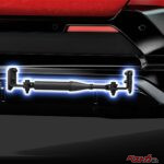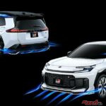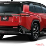 フロントスポイラーは横方向に加えて上向き形状を通し、ダウンフォースの増加を狙いながらフロントタイヤをできるだけ隠して、乱流の抑制効果を高めている。マットブラック&ガンメタリックのモノトーンカラーに、GRを想起させるレッドのセンターオーナメントが加わり、スポーティな世界観を鮮明に主張。さらにガンメタリック部を車両横方向に張り出すことでロール抑制効果を狙い、後方のウイングレット形状によりリヤタイヤへの乱流抑制効果も高めている。