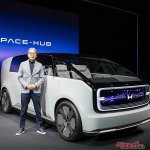 もう1台の「スペースハブ」は、前述のサルーンをモノスペースミニバン的方向に拡張したモデル。リアエンドまで延びる高いルーフラインがさらに広大な室内を形成しており、多人数乗車はもちろん、さまざまなアクティビティにも使えるような空間がウリだ。