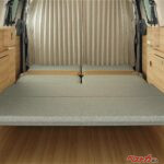 そのシートの目の前には、車幅いっぱいにテーブルが設置されている。前後にスライドさせられるので、お茶を飲むにも仕事をするにも自在の使い方ができる。さらに後方にはしっかりしたベッドボードがあり、2in1シートと合体することで、最大2人が寝れる完全フラットな空間が作れる。
