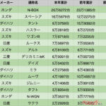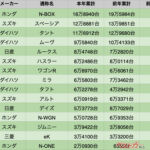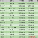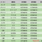 一般社団法人 全国軽自動車協会連合会(全軽自協)のデータから、最新の軽自動車新車販売ランキングをご紹介! ※通称名についてはメーカーごとに同一車名のものを合算して集計しています(アルト、ワゴンR、ミラ、ムーヴ、eK、ピクシスなど)。またデリカミニ/eKにeKクロスEVは合算されていません
