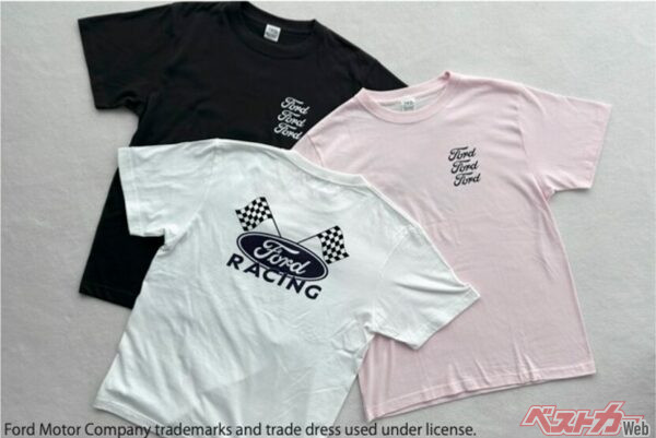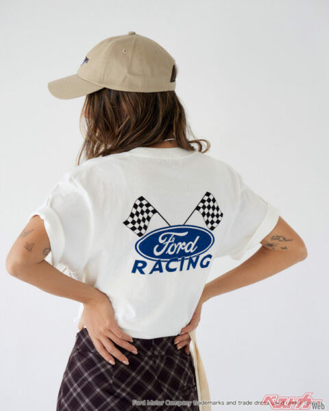 プリントTシャツは、「オフホワイト」、「チャコールグレー」、「ピンク」の3色がラインナップ。背中にはフォードのロゴマークとクロスしたチェッカーフラッグのデザインがあしらわれ、レーシーな雰囲気に。正面は、胸元にシンプルなフォードのロゴがアクセントとなっています。