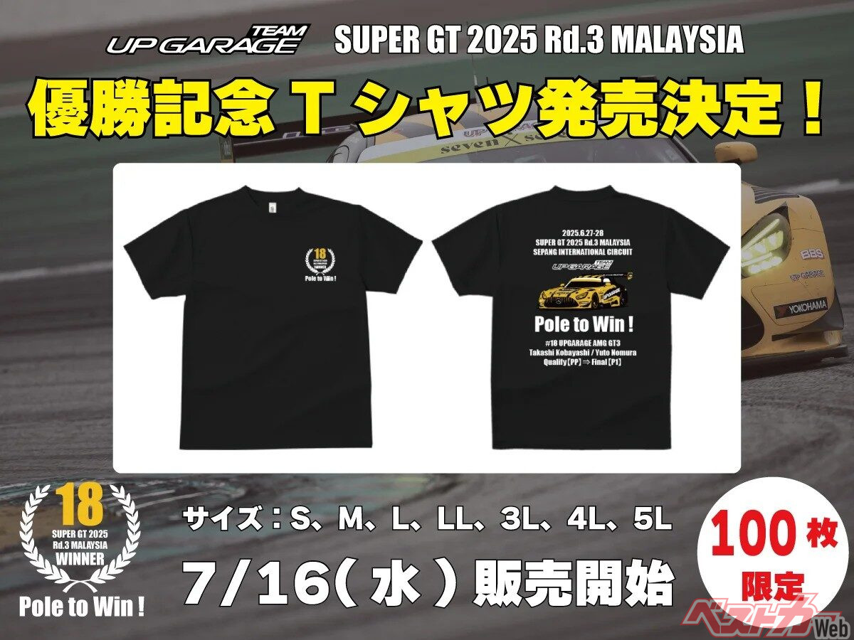 SUPER GT 2025第3戦セパンでポールトゥウィンを果たしたTEAM UPGARAGEが、記念Tシャツをわずか100枚限定で発売! GT300ファンはもちろん、モータースポーツ好きの心をくすぐる特別アイテムの魅力を紹介。入手できるのは今だけ!