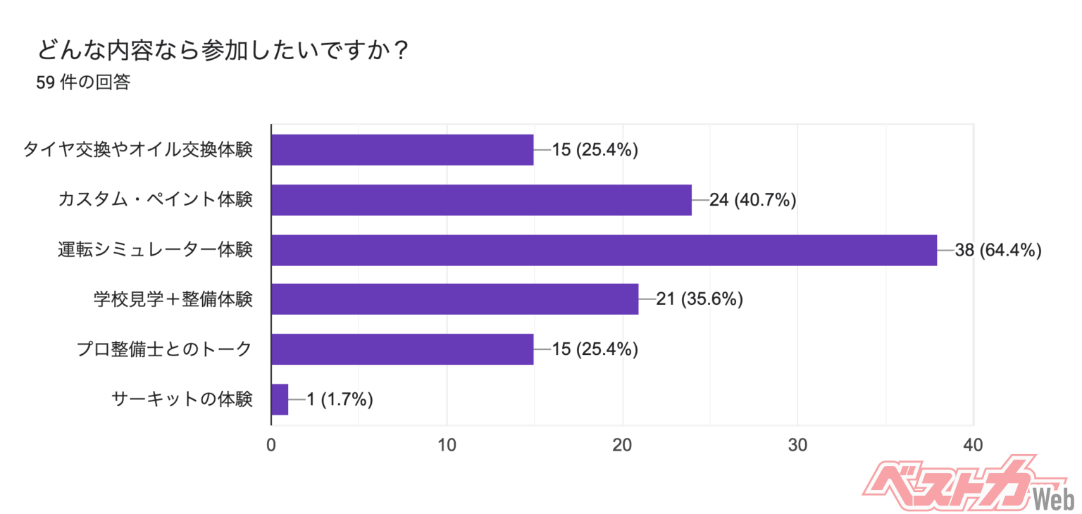 また、参加したい内容については、「運転シミュレーター体験」が最も高評価で64.4%。次いで「カスタム・ペイント体験」、「学校見学+整備体験」、「タイヤ交換やオイル交換の体験」といった結果に。実際に身をもって体験できるものに関心を持つかたが多いようです。