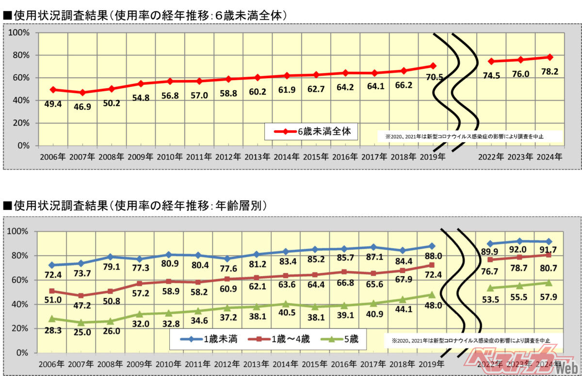 ただし、約20年前に当たる2006年時点での使用状況調査結果が49.4%であったことに鑑みれば、全国平均78.2という数値はかなり上がったといえ、安全意識は相当向上したと言えます。使用率が大幅に下がる5歳時も2006年が28.3%だったのに比べれば、2024年が57.9%にまで上昇しています。
