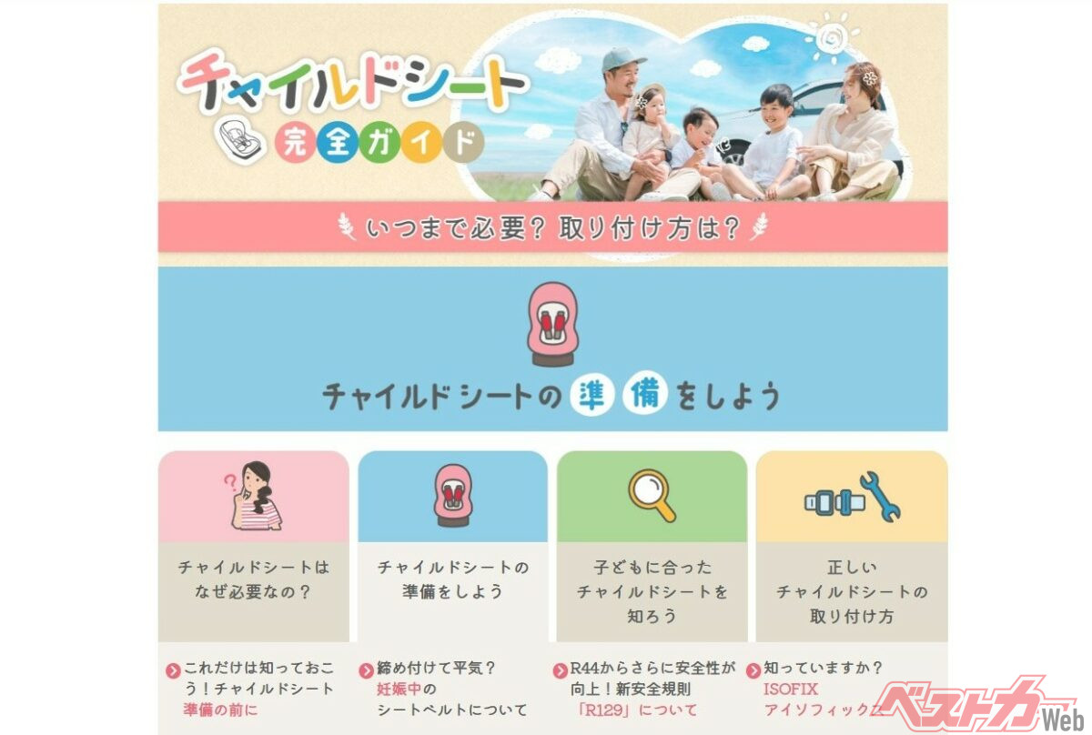JAFのホームぺージではチャイルドシートの取り付けなどに関する詳細な紹介ページが用意されている