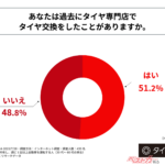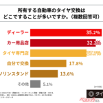 報告によれば、タイヤ交換経験のあるユーザーのうち51.2%が「タイヤ専門店を利用したことがある」と回答したものの、利用先のトップはディーラーで35.2%、次にカー用品店で32.2%、専門店は27.7%と並びました。