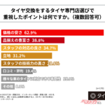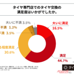 また、タイヤ専門店で交換した経験がある人のうち、9割以上が「満足」「ある程度満足」「大いに満足」と回答しているのも興味深い結果です。これらの意見を総合すると、価格とラインナップ、そして専門知識を持つスタッフの接客が支持につながっていると考えられます。