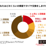タイヤ交換に関しては頻度も気になるところですが、最も多かったのは「5年に1回程度」の33.7%。ただ、「3年に1回程度」(22.9%)や「半年に1回程度」(16.0%)と、より短いスパンで交換するユーザーも目立ちました。
