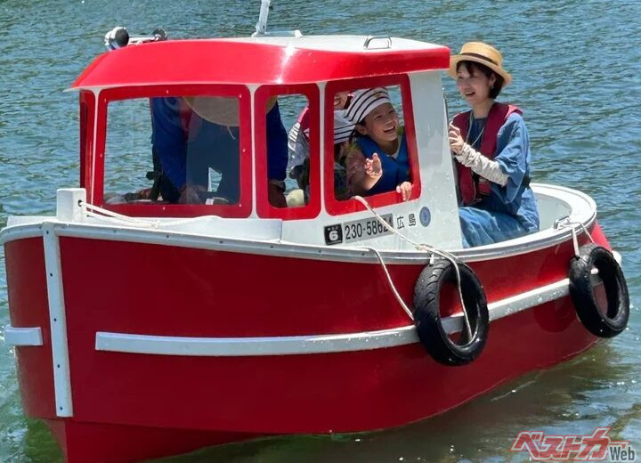 今回の試作モデルでは操船体験も実施され、子供から大人まで安全に楽しめることが確認されています。写真にあるように、親子で乗りながら笑顔あふれるひと時を過ごすことができるのも、このボートならではの魅力です。