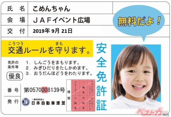 JAF秋田支部のブースでは、小学生以下の子どもを対象に「JAF子ども安全免許証」が無料で発行される予定。来場した子どもはタッチパネルで名前を入力し、交通安全に関するクイズに挑戦。最後に顔写真を撮影し、その場で免許証型のカードが手渡されます。