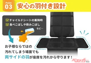 子供が飲み物をこぼしたり、靴でシートを汚してしまうシーンは日常茶飯事。そこで役立つのがサイドの羽付きデザインです。左右の羽が汚れの拡散を防ぎ、車内の美観を長くキープします。