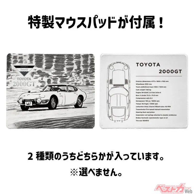 また、パッケージには2000GTの世界観をさらに楽しめるオリジナルデザインのマウスパッド(2種類のうち1枚)が付属。机の上が一気にショールームのような雰囲気に変わります。