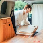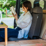 VANLIFE ROOMKITは、シエンタ用なので、走行時はもちろん通常の5人乗り。だけど、休憩時は大人2人がゆったりくつろげる部屋へ、工具なしでスムーズに切り替えられるのが特徴です。室内外で使えるテーブルも付属するので、手軽に車内のくつろぎ空間を設置できちゃいます。
