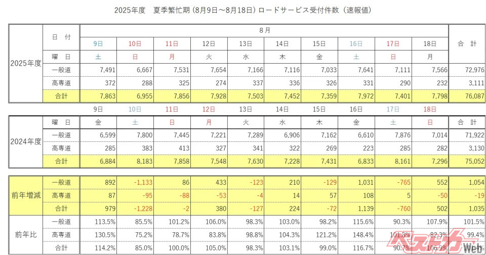 内訳を見ると、一般道路での受付が7万2976件、高速道路や専用道路では3111件。依然として一般道路でのトラブルが大半を占めています。添付資料のデータでは、特に8月9日(金)と16日(金)に前年を大きく上回る件数となっており、帰省ラッシュやUターンラッシュが影響したとみられます。