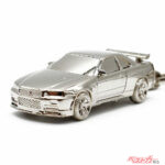 製品は例に漏れず、ダイキャストにクロームメッキ仕上げ。ヘッドライトやフェンダーの張り出し、リアのボリューム感まで丁寧に再現された造形で、手のひらサイズでもR34の存在感を引き出しています。