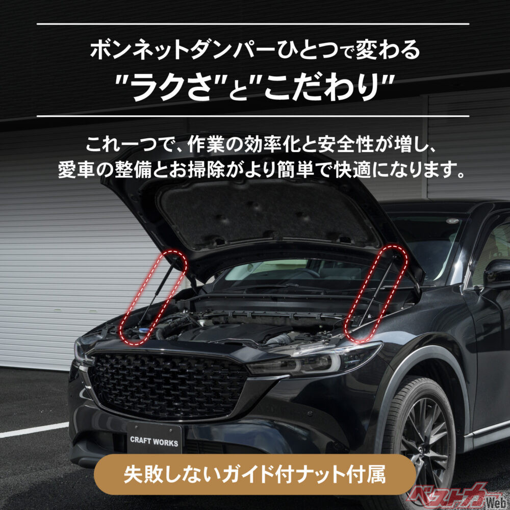 ボンネットの開閉が重くて面倒……そんな悩みを解決する「CRAFT WORKS製CX-5/CX-8専用ボンネットダンパー」が新登場。車検対応・簡単取付で、整備も掃除もスムーズに変わる注目アイテムだ。