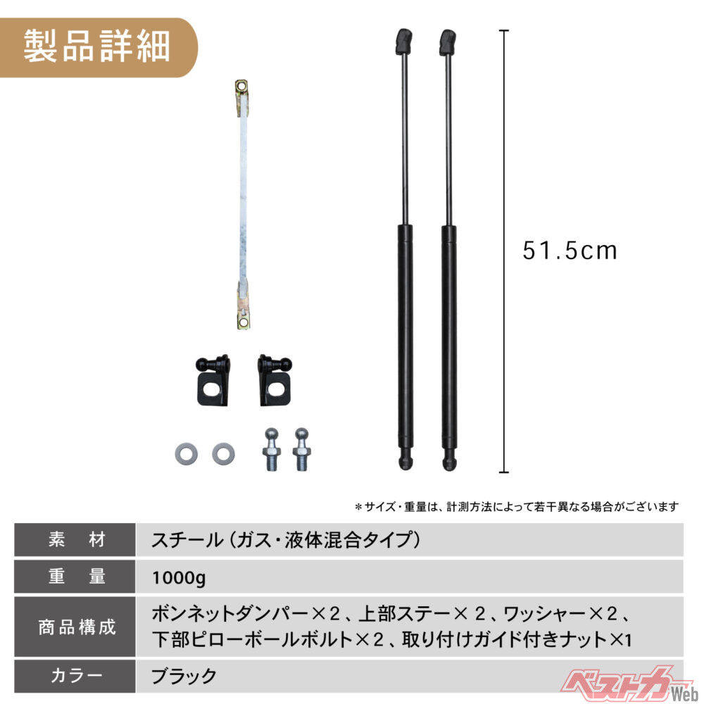 この製品の魅力は、機能性だけでなくデザイン性にもある。カラーは落ち着いたブラックで、エンジンルームに自然に溶け込む質感。ボンネットを支える2本のダンパーは、無骨になりすぎず上品な印象を与える仕上がりだ。