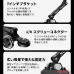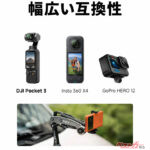 また、1/4インチネジ穴を備えており、GoPro、DJI Osmo Pocket、Insta360など主要アクションカメラのほか、スマートフォンの固定も可能。延長ロッドや三脚マウントなどのアクセサリーとも互換性があり、用途に応じた拡張が自在だ。