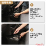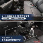 設置方法は簡単で、助手席側から差し込むだけのワンアクション。純正トレイを残したまま使える点もムーヴオーナーにはうれしい。もちろんシートの前後スライドも可能(最後置〜7.5cm前まで対応)。