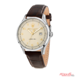 クォーツの3針モデル(3万3000円)はアイボリーダイヤルと精緻なインデックスで上品にまとめられ、10気圧防水と実用性も高い。華美になりすぎないデザインは、クルマイベントや休日の街歩きにも相性がよい。