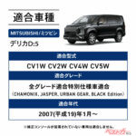 適合型式はCV1W〜CV5W、特別仕様車(CHAMONIX、JASPER、URBAN GEAR、BLACK Edition)にも対応。2007年以降のデリカD:5ユーザーであれば、ほぼすべて装着できる。