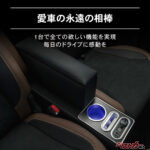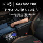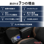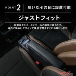センターコンソールの隙間に置くだけで設置でき、届いたその日に使い始められる設計が特徴です。同ブランドおなじみの車内に馴染む専用デザインで、既存装備のアームレストやシートベルトとの干渉も避けられるのがポイント。