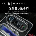 点灯スイッチを押すだけで内部ライトが点灯し、収納物の位置確認が容易になります。明るさは3段階で調整でき、状況に合わせた優しい光量で照らしてくれるとのこと。電源オン時には差し込み口周辺も発光し、暗い車内で電源位置を探す手間を軽減。