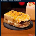 館内のカフェには、広島に拠点を持つ「八天堂」のカスタードクリームを使用した限定メニューも登場。注目のコラボメニューは2種類。ひとつはベシャメルソースとカスタードクリームを合わせた濃厚な味わいが特徴の「クリーミークロックムッシュ」。