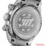 ケース背面の裏蓋にはホイールを模したテクスチャーが施され、頭文字D連載30周年記念ロゴが印字されています。腕から外したときにも作品とのコラボレーションを感じられる仕様で、コレクションとして眺めても楽しめるポイントです。