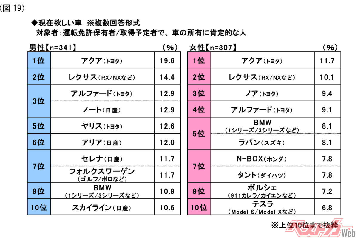 また、男性で3位を獲得したのは、アルファードとノート。女性ではノアが3位で、アルファードは4位となっている。これらの結果を総合してみると、どうやら実用性の高い車種やブランド、快適な移動空間への憧れが集まるようだ。