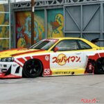 ベースとなったのは日産スカイライン(ER34)。車名は「LB-ER34 Super Silhouette SKYLINE」である。スッパイマンのメインカラーであるイエローとエネルギッシュなレッドを大胆にまとい、ボディ全体でブランドの世界観を表現。思わず二度見してしまう強烈なビジュアルに仕上がっている。