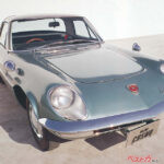 マツダ コスモスポーツ(1967年登場)。世界初の2ローターエンジン搭載のスポーツカー。491cc×2ローターで128psを発揮。流麗なクーペスタイルも特徴