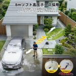 また、8mの高圧ホースと2mの水道ホースが標準装備されているため、本体を動かさず広範囲を一気に洗浄可能。これは実際の作業効率に大きく影響するポイントであり、家庭用としては十分以上のスペックといえるだろう。