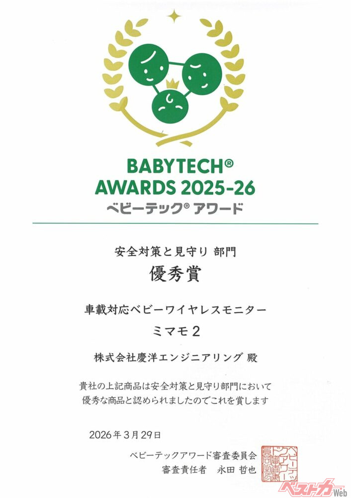 そんな悩みに応える製品として登場したのが、KEIYOの車載対応ベビーモニター「ミマモ2」だ。同製品は2026年3月に発売され、早くも「BabyTech Awards 2025-26 安全対策と見守り部門 優秀賞」を受賞。育児×テクノロジーの分野で高い評価を獲得した。