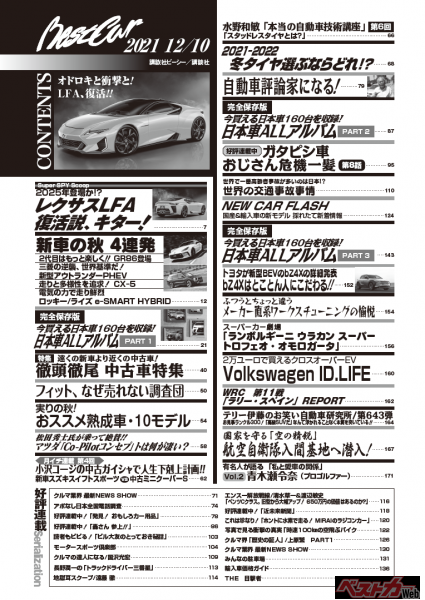 今年はトヨタGR86/スバルBRZ、トヨタアクア、日産ノートシリーズ、トヨタカローラクロス、トヨタランドクルーザー、ホンダヴェゼル、レクサスNX、スズキワゴンRスマイルなどなど、多彩な日本車が誕生しましたが、それらを含めた全160モデルをズラリと紹介するカタログ企画です。