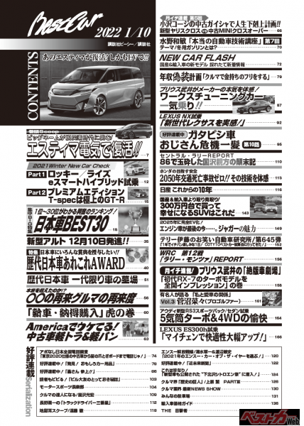 本誌おなじみの日本を代表する20名のモータージャーナリストのみなさんが自分のBEST10を選出し、その結果を総合的に集計して「日本車BEST30」を決定、1~30位を発表する大特集です。