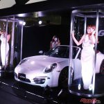 その中で目を引いたのは、ソフト99のコーティング「G’ZOX」を施したポルシェを展示したブースだ。展示車の両サイドにはドア付きの透明なケースが用意され、その中でのみコンパニオンがマスクを外すことができるのだ。