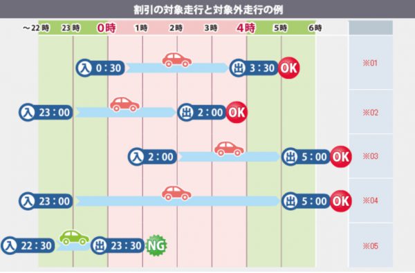 全国の高速道路で実施される深夜割引。対象は午前0時〜早朝4時