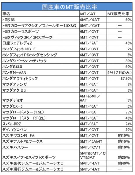 今や日本市場の販売台数におけるMT車の比率は、わずか2.6%(2017年)。前述のマツダですら、ロードスターのMT比率は7割を超えているけれど、全体としては1割以下の7.4%にとどまっている。