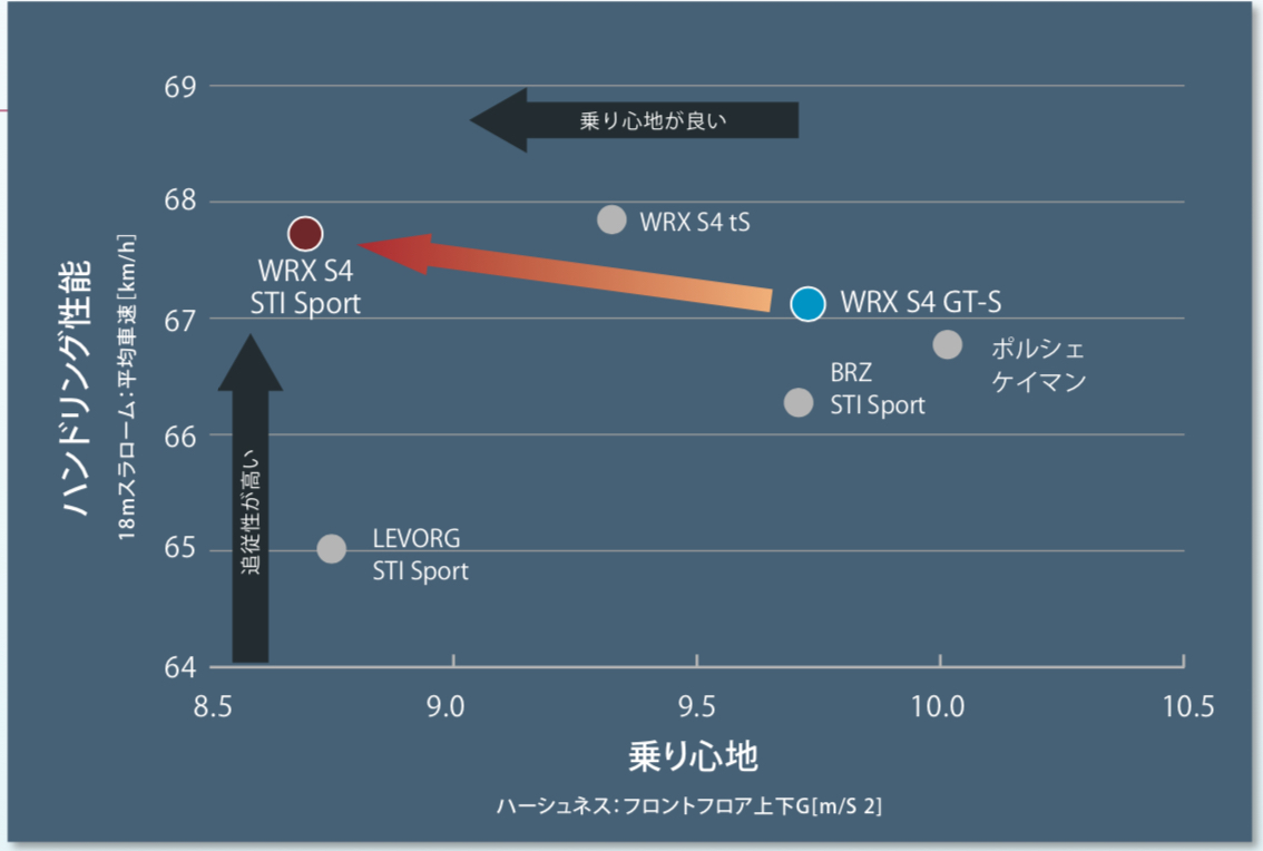 具体的にはステアリングを切り始めてからノーズが回答を始めるまでの「ヨー応答時間」とリアが動いて横Gが立ち上がるまでの「横G応答時間」を大幅に短縮させ、WRXシリーズが実現する意のままの走りを高いレベルにまで引き上げたという。