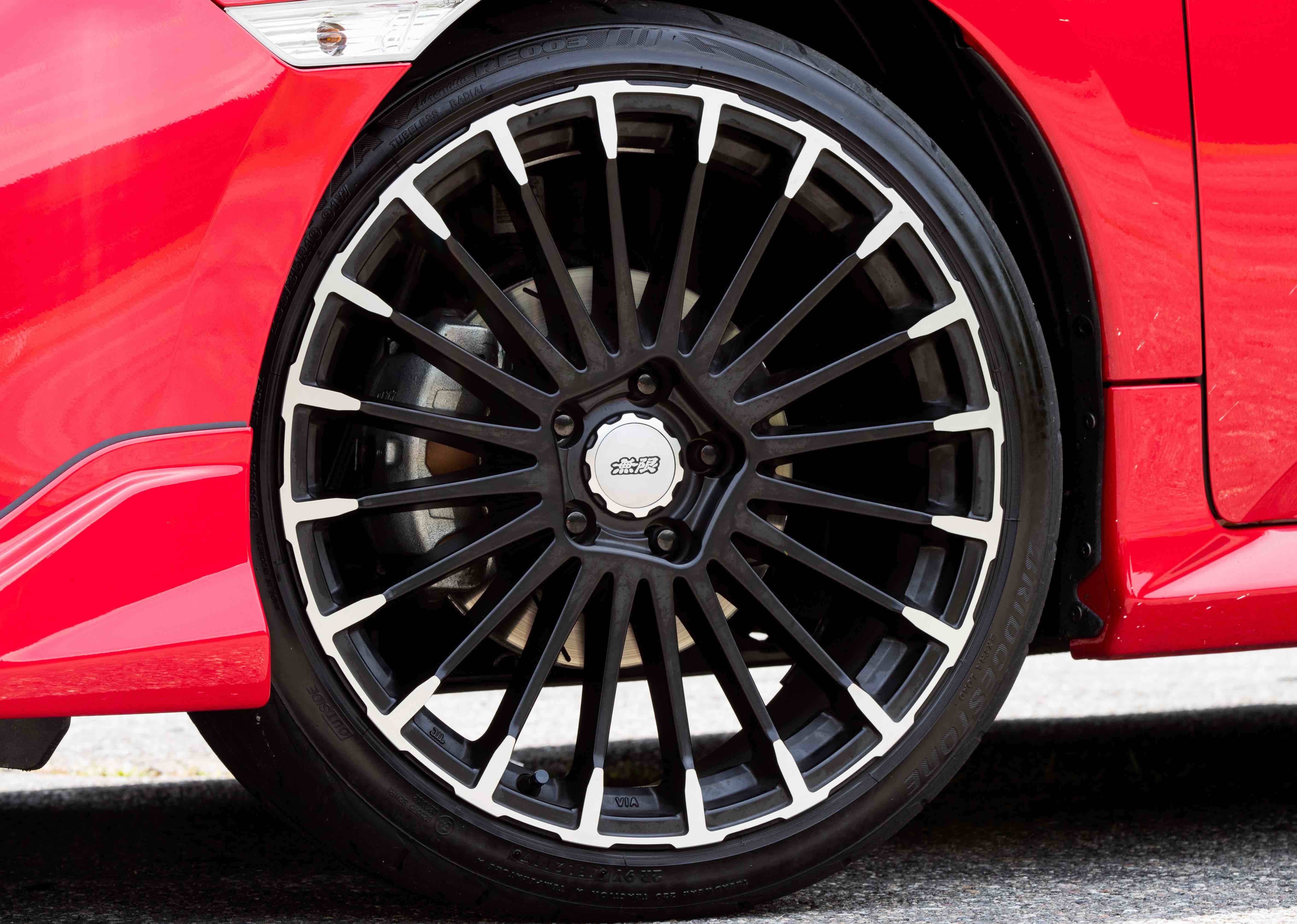 切削面とブラック塗装のツートーンとした流麗なデザインと軽量化を両立したアルミホイールMDA。サイズは8J×19インチのインセット55。価格は5万760円(1本)。このほか7.5J×18インチ、インセット50(1本4本5360円)も用意している