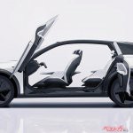 「ROBO01」だが、見たところCセグ相当のSUVといった雰囲気。エクステリアは未来的で、前ドアは斜め上、リアドアは後方に開く。ダッシュボード上には超横長のディスプレイが置かれ、ヨーク型ステアリングは格納も可能なようだ。