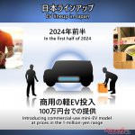 2022年4月に発表された四輪電動ビジネス発表会では、日本における四輪EV展開としては、2024年前半に商用軽EVを100万円台で投入し、その後、パーソナル向けの軽EV、SUVタイプのEVを適時投入する予定としている。
