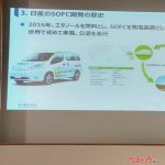 日産が今回採用したSOFCは、トヨタやホンダがFCVに採用しているPEFC(固体高分子形燃料電池)に比べて電解質のイオンの向きに違いがあり、より高温となる600~800度まで温度を上げる必要があり、構造的にまだクルマには採用しづらいのだという。将来的な乗用車への採用に向け、今後も研究を続けていくことになる。