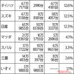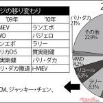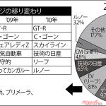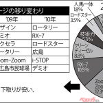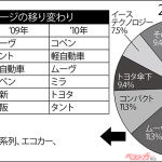 4位は軽自動車。漠然としているが、軽自動車が根幹をなしていることは間違いない。注目したいのは5位の省燃費技術で、ワゴンRのエネチャージもそうだが、アルトエコがJC08モードで30.2km/Lとミライースの30.0km/Lを上回る数字を出したことが大きいのだろう。
