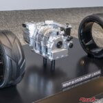 内容を極めて簡単に説明すると、ロータリーエンジン+48Vバッテリー+モーターのマイルドハイブリッドで、エンジンとモーターで後輪を駆動。前輪左右にはインホイールモーターを備えており、スイッチ操作でエンジンへの燃料供給をカットし、モーターのみの走行もできるというものだ。トランスミッションを後輪車軸上に配置するトランスアクスル方式も採用している。