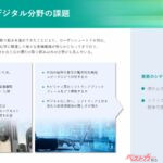 特に注目なのは、各自動車メーカーが現在直面している具体的な「課題」が記されているところ。「インフラ・デジタル分野の課題」と称されたページでは、「充電ステーションが少ないため、電動車の普及に課題」、「カーボンニュートラル・資源循環経済に向けて、地域社会・行政との連携が必要」、「カーボンニュートラル対応はイニシャルコスト、ランニングコスト共に中小物流事業者の経営を圧迫」があげられ、「最悪のシナリオとして…」と銘打たれ、「海外との電動車競争に敗北」、「ソフトウェア領域での競争力獲得に失敗」と明記されている点があげられる。