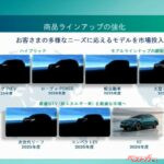 会見に投影された、「お客さまの多様なニーズに応えるモデルを市場投入」というスライドには、2025年に北米市場へ投入されるローグPHEV、2026年度投入予定のローグe-POWERとともに、2025年度には新型軽自動車が、2026年度には大型ミニバンのシルエットが映し出されていた。