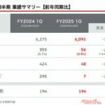 三菱自動車の第一四半期(Q1)決算が発表された。2025年4月からアメリカで発動した高関税(影響額-144億円)と為替変動差損(同-209億円)が直撃したかたちとなり、Q1の売上高は6,091億円(前年同期比-184億円/-3%)、営業利益56億円(同-299億円/-84%)、当期純利益7億円(同-288/-98%)と、前期比で大幅な減収減益となった。