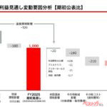 今回のポイントは二つ。第一に、関税が25%→15%に下がる前提を置いても(10月以降想定)通期で見るとアメリカ関連のコスト増やミックス悪化、販売費の積み増しが依然として重く、営業利益面ではマイナス320億円の直接関税負担の影が残ること。